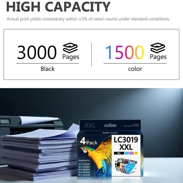 LC3019 XXL: 3, 000 Pages for LC3019 XXL black ink cartridge, 1, 500 Pages for LC3019 XXL color ink cartridge ^^ The LC3019 XXL ink cartridge is rigorously tested to deliver professional-grade, dark, crisp prints with zero streaks, leaks, or smudgingensuring flawless performance every time ^^