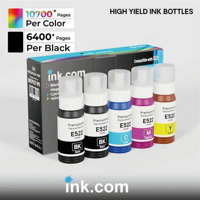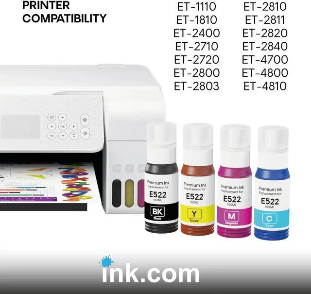 This high-capacity compatible 522 ink refill set is specifically designed to be compatible with Epson EcoTank printers that use compatible 522 ink, ensuring smooth performance and consistent results. Formulated to work seamlessly with Epson ET-2803, ET-2800, ET-2720, and ET-4800 printers, this refill ink delivers reliable output for everyday home, school, and office printing needs. ^^ High Capacity Ink Bottles for Long-Lasting Printing Each set includes five large-capacity ink bottles engineered for extended use, reducing the need for frequent refills. Ideal for high-volume printing, this compatible 522 ink refill pack helps lower cost per page while maintaining crisp text and vibrant color output for documents, reports, photos, and graphics without sacrificing quality.