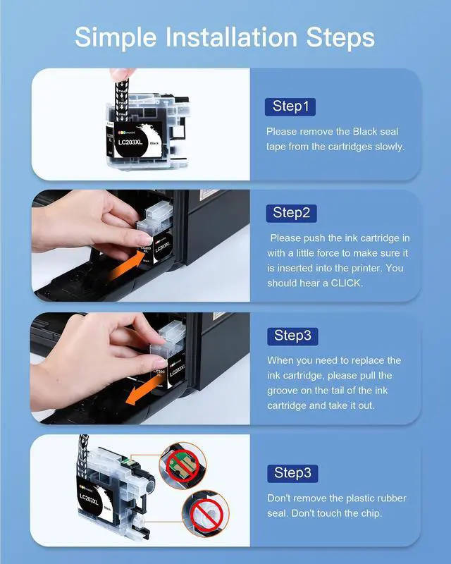 Page yield: Approximately 550 pages per LC203BK High Yield black Ink Cartridges and 550 per LC203XL Ink Cartridges color at 5% coverage ^^ XL LC203 ink cartridges for brother printer MFC-J4320DW, MFC-J4420DW, MFC-J460DW, MFC-J4620DW, MFC-J480DW, MFC-J485DW, MFC-J5520DW, MFC-J5620DW, MFC-J5720DW, MFC-J680DW, MFC-j885DW, MFC-J88DW Inkjet Printer ^^ Our LC203 XL Ink Cartridges deliver quality printing, giving you vivid and natural prints ^^