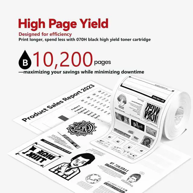 High-Yield Printing: Each 070H High-capacity Black Toner Cartridge yields up to 10, 200 pages at 5% coverage (A4/Letter size), reducing your replacement frequency compared to standard yield cartridges ^^