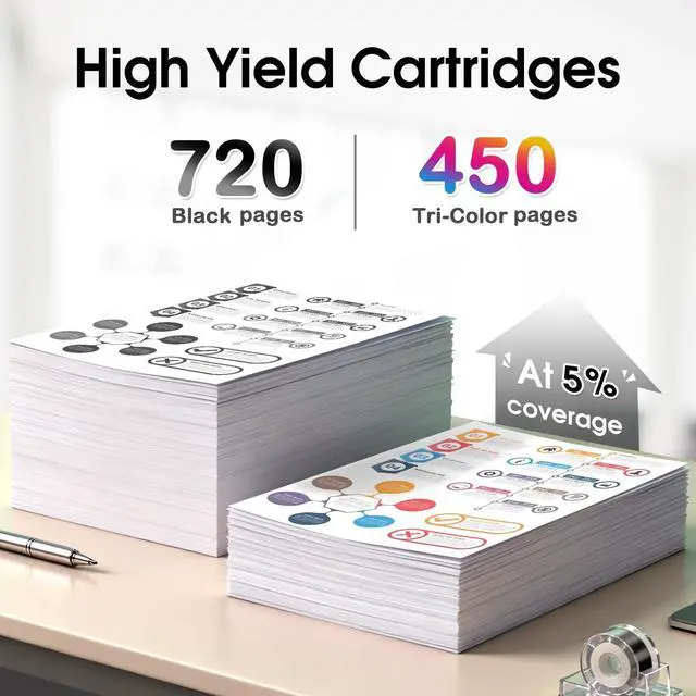 Printer Compatibility: OfficeJet 200 250 285 5740 5741 5742 5743 5744 5745 5746 8040 8045 ^^ High Page Yield 62XL printer ink cartridges designed for efficiency, our high-capacity cartridges let you print with confidence. The black ink cartridge yields approximately 720 pages, while the tri-color offers around 450 pages (at 5% coverage). Ideal for families with printing needs, remote workers, and small offices. ^^ Outstanding Print QualityFrom detailed lesson plans and business reports to cherished family photos, 62XL printer ink cartridges delivers exceptional clarity. Achieve clear black text and richly colored images with true-to-life accuracy. Equipped with upgraded chips, the replacement for HP 62XL ink cartridges will compatible with printers. Whether its last-minute documents for a remote meeting or your childs school project due tomorrow, count on reliable performance every time with 62XL combo pack ink cartridges. ^^ Reliable PerformanceEvery 62XL printer ink cartridge is rigorously tested to meet strict quality standards, ensuring smooth ink flow and excellent print results. For optimal performance, avoid touching the chip or ink nozzles during installation. ^^ Whats Included & SupportEach combo pack includes one 62XL Black and one 62XL Tri-Color ink cartridge, along with a user guide.