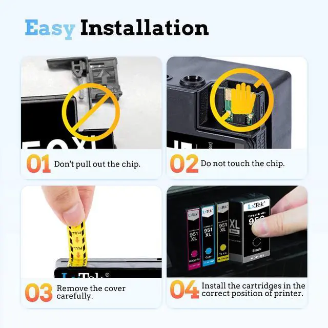Tip: The packaging of 950xl and 951xl ink cartridges combo pack you received may differ from what you see on the page, as we are currently upgrading the packaging. There are no differences in performance, capacity, or print quality between the new and old packaging ^^ If your printer does not recognize the 950 951 ink cartridges, please try the following troubleshooting steps: 1. do not remove the protective seal covering the ink port 2. do not touch the chip 3. take off the yellow tape