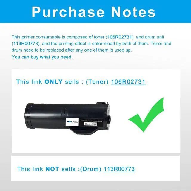 Reliable Quality: LCL 106R02731 cartridge uses high quality toner, toner particle size distribution, good mobility, high transfer rate, resulting in a clear image and high gloss print effect; Printing efficiency is high, waste powder rate is low, so as to ensure sufficient page yield.