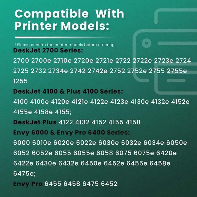 • For HP 67 Black Ink Cartridge XL work with Envy/Envy Pro 6000, 6000e, 6010, 6010e, 6020, 6020e, 6022, 6022e, 6030, 6030e, 6032, 6032e, 6034, 6034e, 6050e, 6052, 6052e, 6055, 6055e, 6058, 6065e, 6066e, 6075, 6075e, 6400, 6420, 6420e, 6422, 6422e, 6430, 6430e, 6432, 6432e, 6450e, 6452, 6452e, 6455, 6455e,