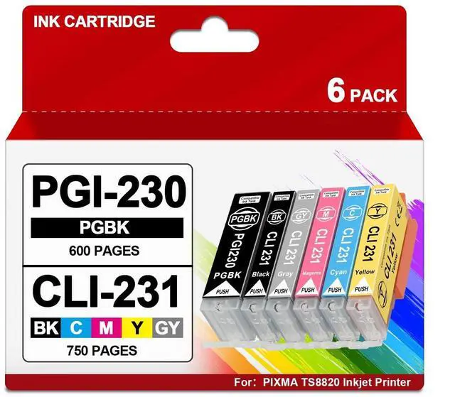 High Yield and CompatibilityThis PGI230 CLI231 XXL ink cartridge set is specifically designed for the PIXMA TS8820 inkjet printer, ensuring perfect compatibility and outstanding print quality. The PGI-230XL PGBK ink cartridge yields approximately 600 pages, while the CLI 231 Black ink cartridge yields about 850 pages, making it ideal for high-volume printing needs ^^ Complete Six-Pack Set for All Your Printing NeedsThis set offers a complete array of 6 compatible ink cartridges: 1 PGBK (Pigment Black), 1 Black, 1 Cyan, 1 Magenta, 1 Yellow, and 1 Grey. With these PG230 CLI231 cartridges, youll have everything you need for vibrant color and sharp black-and-white prints from your PIXMA TS8820 ^^ Exceptional Print QualityFeaturing high-quality ink, our PGI-230 and CLI-231 cartridges deliver clear and vivid prints that do not fade over time. Whether youre printing photos or documents, these high-yield cartridges provide professional-quality output every time ^^ Easy Installation with PGI-230 CLI-231 ChipEach cartridge in this PG230 CLI231 compatible set is equipped with a chip for seamless installation. The user-friendly design eliminates concerns about ink monitoring and compatibility, giving you a hassle-free printing experience with your PIXMA TS8820 ^^ Cost-Effective and Eco-Friendly OptionUsing our PGI 230 and CLI 231 high yield cartridges not only reduces the frequency of replacements but also lowers your printing costs significantly. This eco-friendly choice minimizes waste, making it an ideal solution for those looking to go green while enjoying high-quality prints