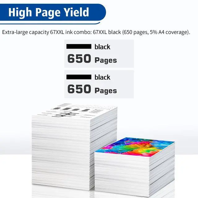 Widely compatibleCompatible with HP envy 6055e/6030/6032/6034/6052/6058/6075, For DeskJet 1255/2300/2722/2723/2724/2725/2742/2752/2755, for DeskJet Plus 4122/4123/4132/4140/4152/4155/4258 Printers. ^^ Package Contents Total 2 Packs of Remanufactured 67XXL 67 ink cartridges black combo pack (1 x 67XXL Black, 1 x 67XXL Tri-Color ). (NOT ORIGINAL). ^^ High Page Yield Extra-large capacity 67XXL 67XL ink, 650 pages per 67xl black ink cartridge. compatible with hp envy 6055e ink cartridges (with 5% coverage of A4 paper). ^^ Outstanding Print QualityFANSHENG 67XXL ink cartridges equipped with latest Intelligent chip ensure 100% compatible with your printers. The results are clear and detailed, ideal for all your office and home printing requirements.