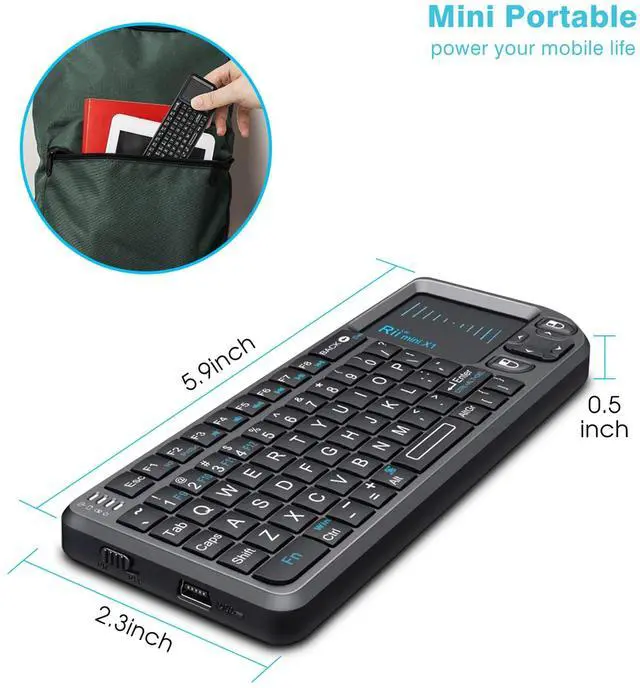 ^^ User-friendly Design: With a familiar QWERTY layout and ultra-sensitive touchpad, this compact keyboard offers an ergonomic typing experience. It includes handy features such as media controls, shortcut keys and a 90-degree flip design for optimum comfort. ^^ LONG LIFE BATTERY - Powered by a rechargeable lithium-ion battery, the Rii X1 keyboard includes auto sleep and wake functions to maintain power and minimize the difficulty of frequent battery changes.