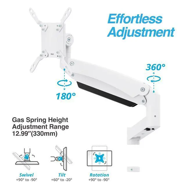 Smooth Full Motion Adjustments: Adjust monitor height up to 12.99" (330mm) with smooth gas spring lift for improved posture and comfort. Enjoy 360 arm rotation, 180 swivel, +60/-20 tilt, and 20.7" (526mm) extension for the perfect ergonomic position.