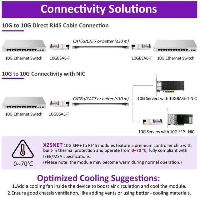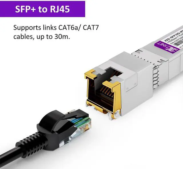 RJ45: Converts SFP+ ports to RJ45 ports, enabling seamless fiber-to-traditional Ethernet connectivity. ^^ RJ45 CopperThis 10Gbase-t module supports link to CAT6a/CAT7 cables, up to 30m.