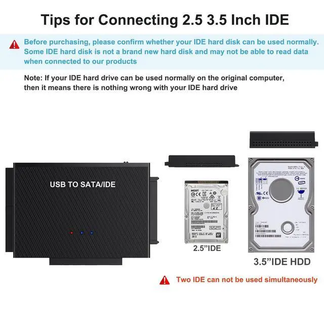 • HUMANIZED DESIGN: This ide hard drive converter adopts a 2-IN-1 (USB+USB-C port)designed, USB to USB-C adapter that plugs into the USB port to match your laptop and is not limited by the computer model. It also supports hot swapping, allowing you to connect or disconnect drives without having to restart your computer. On/off switch for HDD protection and the LED light in