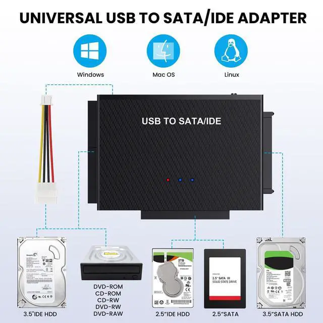 • UNIVERSAL HARD DRIVE READER: SATA and IDE to USB 3.0 adapter supports 2.5"/3.5" HDD/SSD, 2.5"/3.5" IDE, 5.25" DVD-ROM, CD-ROM, CD-RW, DVD-RW, DVD + RW optical drive. With dual-head IDE connector (40pin and 44pin) plus one SATA III connector, lt's compatible with 2.5"/3.5" DE/SATA hard drives