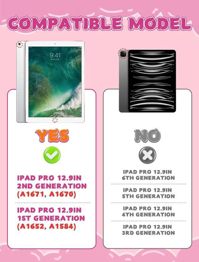COMPATIBILITY: E-puhate kids case is designed for old models of iPad Pro 12.9 Case 2nd Generation 2017 (A1671, A1670) and iPad Pro 12.9 Case 1st Generation 2015 (A1652, A1584). It is not compatible with any other iPad models. Please check the bottom of your iPad to find the model number. (NOT for 2018-2022 3rd-6th Gen) ^^