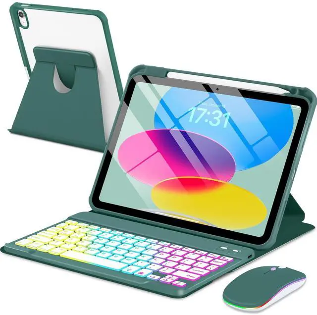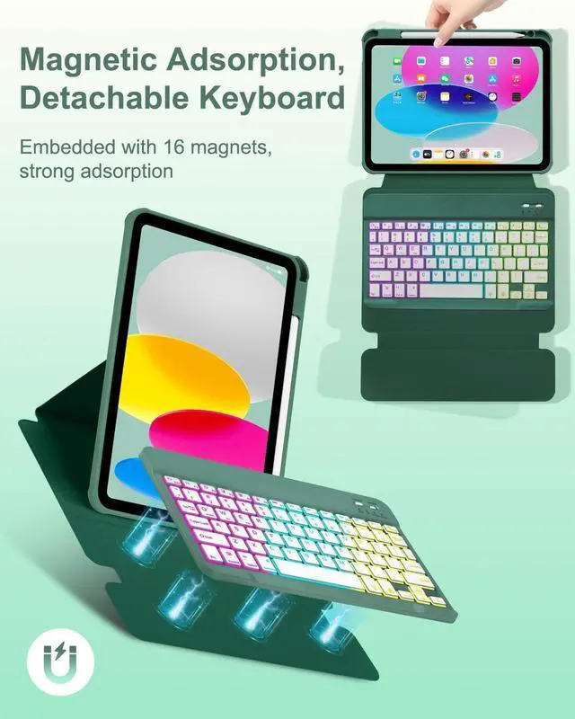 Generation (Model Number: A2696/A2757/A2777/A3162). Please check the model number starting with "AXXXX" on the back of your iPad before purchasing. (This product does not include: tablets, pencils! ) ^^ 7 Colors Rainbow Backlight KeyboardThe RGB rainbow backlight keyboard for iPad 10th generation can provide you with a typing experience in the dark, and the backlight has 7 adjustable colors. These colors can be automatically switched in breathing light mode, and the brightness of the keyboard can be adjusted by pressing Fn+light key. When you don't need the backlight, you can turn it off ^^ Rechargeable Keyboard, Long-Lasting Battery LifeThis keyboard has a built-in 400 mAh lithium battery, which charges for 2-3 hours and can work continuously for up to 50 hours under normal use (without backlit ), which will automatically enter sleep mode when not used for a long time to save power, and click any key to instantly the wake-up. Standby state lasts up to 90 days, which is very friendly for travel and mobile office ^^ Multi-Function Keys, Detachable KeyboardRich function shortcut keys allow you to use your iPad more efficiently and comfortably, such as editing documents, browsing applications, and creating presentations. The detachable keyboard can be used alone and can be disassembled when not in use, which is very convenient to carry ^^ Strong Magnetic Adsorption, 360-Degree RotatableThis protective case is made of premium PU leather and has 16 built-in powerful magnets, which can firmly absorb the keyboard to prevent the keyboard from moving and falling.