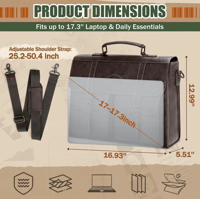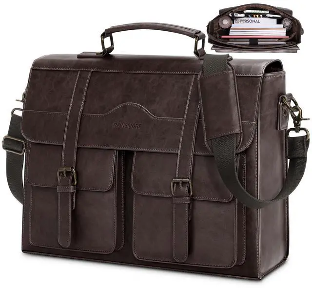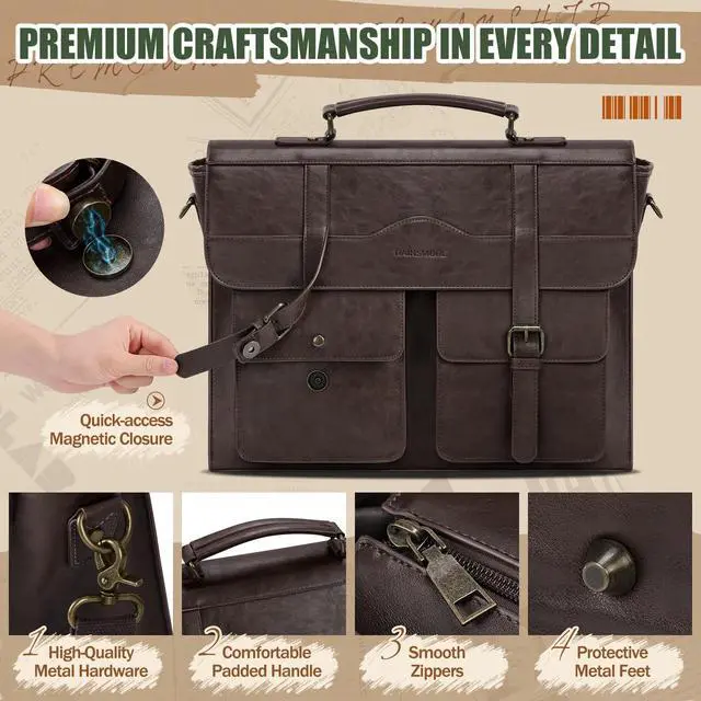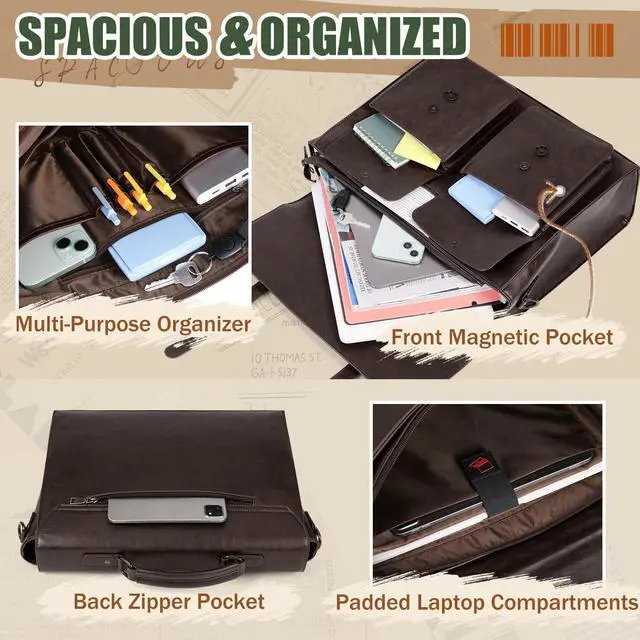DescriptionUpgrade your everyday carry with the RAINSMORE Vintage Leather Messenger Bag a sophisticated yet functional companion designed for todays busy professionals. Crafted from high-quality water-resistant PU leather with a premium vintage finish, this large satchel combines timeless aesthetics with modern utility. Inside, the messenger bag boasts a spacious, intelligently structured layout. A padded compartment securely fits laptops up to 17.3 inches, while a separate tablet sleeve protects your iPad or e-reader. The main compartment offers ample space for documents, notebooks, or books, along with a built-in organizer that features 4 pen slots, 2 slip pockets, a zippered pouch, and a detachable key holder keeping everything neat and accessible.
