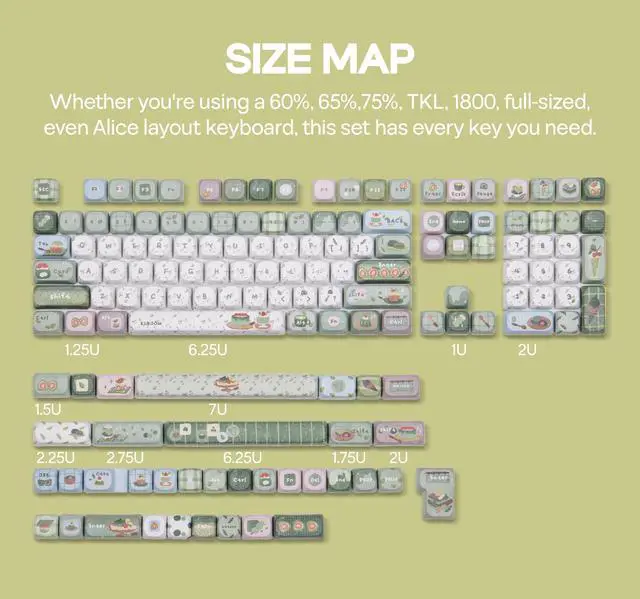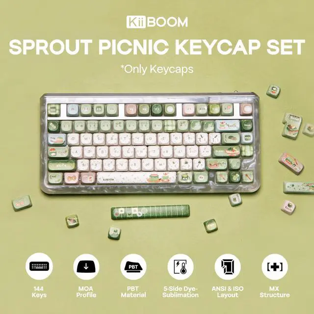 ^^ 144 Keys for Endless Customization From compact 60% boards to full-sized layouts, this 144-key set adapts effortlessly to your keyboard's unique personality. Whether you're a minimalist or a macro enthusiast, the KiiBOOM Sprout Picnic Keycap Set covers specialty keys, modifiers, and novelties, ensuring every row radiates cohesive charm. Compatible with Cherry MX and most MX-style switches, it's a versatile upgrade for any setup. ^^ A Gift of Joy, Perfect for Sharing The Sprout Picnic Keycap Set isn't just an accessoryit's a tangible memory crafted to spark happiness. Packaged with care, this set makes an ideal gift for creators, friends, or anyone who adores whimsical design.