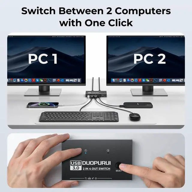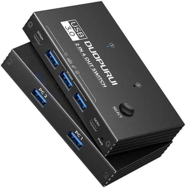 Computers: DUOPURUI 2-in-4-out USB switcher supports switching 2 computers sharing 4 USB devices (such as keyboards, mouse, printers, headphones, hard disk and Webcam). Switch between office computers and personal computers using a single set of keyboard and mouse. No need to manually plug and unplug your