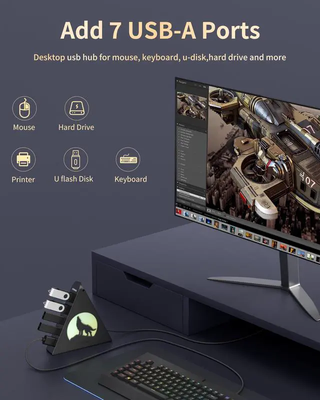 Unique Triangular DesignNote: Please push the button once to turn on/off the night light on the side. Bring energy to your workspace with this stylish rgb usb hub, featuring a vivid wolf-head pattern that cycles through 7 colors. Its triangular, modern form fits perfectly into any desktop usb hub layout while also doubling as a visual centerpiece. The vertical design helps conserve desk spacemaking it a standout usb hub tower for users who want flair with function. It also includes double-sided adhesive so you can mount it wherever works best. ^^ USB-C Port FunctionalityThe USB C port on the side supplies additional power to the hub and ensures stable data transferespecially useful when connecting external hard drives or other power-demanding devices.
