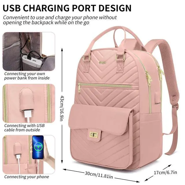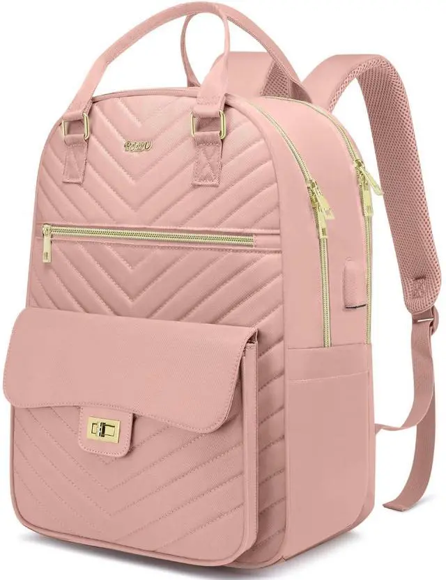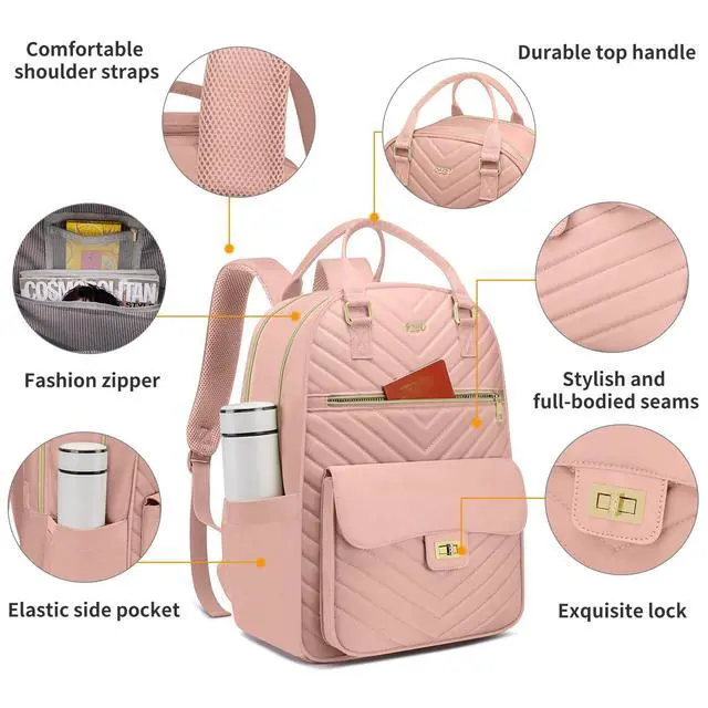 Large Capacity with Lots of PocketsTotal 20 pockets. Generous main compartments and multiple pockets to keep all of your gear secure and organized; Separate laptop compartment included 1 laptop sleeve and 1 tablet sleeve. Roomy main compartment for organizing work essential, school supplies, travel accessories. Front LOCK compartment for quick access small items ^^ Well Thoughtful DesignFashion V quilted + popular gold zipper + convenient top-handle. The heavy duty fabrics are water-repellent, dirt-resistant and easy to care for. Strong padded shoulder strap provides relief when carrying heavier loads. Side pockets for water bottle with elastics.