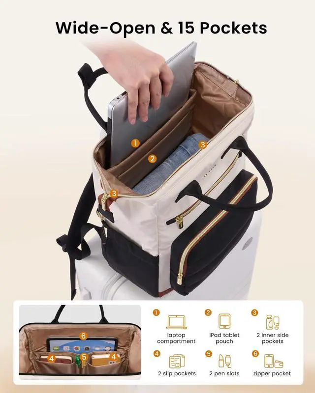 Smart OrganizationThe laptop backpack has 15 pockets, including a padded 15.6" laptop compartment, a 12.9" tablet pouch, and quick-access sections for essentials like keys, wallets, and chargers ^^ Pick Items in a SecondThe steel-frame wide-open design ensures effortless visibility and retrieval of itemsideal for teachers, nurses, or professionals needing fast organization ^^ Secure Side PocketsHolds 40oz water bottles. Both side pockets feature S-ring buckle retractable straps, ensuring your hydration needs are always within reach at the gym, office, or campus ^^ Light & ComfyWith breathable padded straps and a quilted puffer front panel, this travel backpack is comfortable and lightweight, letting you carry essentials without feeling burden.