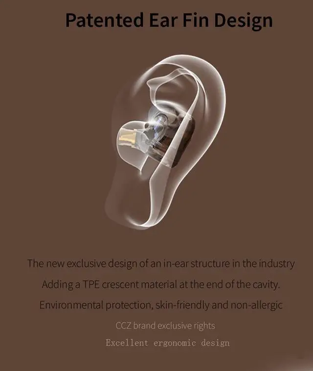 Presents clear musical detailsThe Coffee Bean in ear monitors adopts dual magnetic circuit single DD unit, owns better energy efficiency and transient response for its low impedance and high sensitivity. PETcomposite diaphragm makes the low frequency more elastic, the resolution more accurate and details more rich. The vocal is mellow, and the high frequency is not harsh which also has the outstanding three frequency separation degree at the same time. ^^ Two exclusive patented technologiesCCZ Coffee Bean headset has both with exclusive patented earmuff and exclusive patented earhook. The eartips adopt TPE material, which is comfortable to wear.