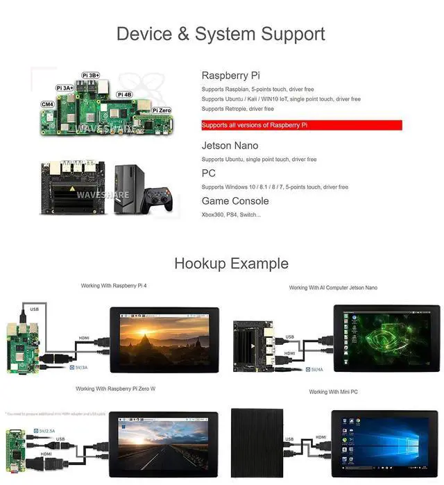 System Support: Raspberry Pi 4B/3 B+ A+ B/2 B/ B+/A+/Zero W/WH, Jetson Nano, Windows 10 / 8.1 / 8 / 7, XBOX360, PS4, Nintendo Switch, etc. Note1. When working with PC, Sometimes LCD willflicker because of undersupplying from USB cable of PC, You need to connect anexternal power supply (5V/2A) to DC port. Some of PC cannot support HDMI screenHot Plug. In this case, restart the PC can solve. 2. When working with Raspberry Pi, Pleaseset the resolution of the LCD by yourself, otherwise, the LCD screen will notwork. If you use the LCD with Raspberry Pi 4B, you need to remove linedtoverlay=vc4-fkms-V3D from config. txt file. 3. When working with Jetson Nano Developer Kit, the display willbe auto-recognized, it is plug and play. 4. When working with game console, Limited bythe game console OS, the touch function is unavailable. Package Content1x 7inch HDMI LCD (H) (with case) 1x HDMI cable1x HDMI to Micro HDMI Adapter1x USB type A plug to micro B plug cable1x Quick start sheetNoteDevelopment Resources and Technical Support are provided, please feel free to contact us if you have any problem!