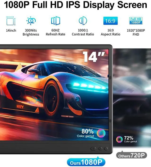 Weighing around 2.9 lbs, its easy to carry, and its compact design allows you to quickly set up a workstation anytime. ^^ [HD Display & Wide Support Bracket] Dual monitor extender equipped with a 14-inch Full HD IPS display, it offers 1920x1080 resolution, 300 nits brightness, and a 1000:1 contrast ratio, delivering vibrant and rich colors. The monitor screen supports brightness and volume adjustment for a comfortable work and entertainment experience. The portable laptop monitor upgraded widened back stand increases desktop support and provides more stable support, while the adjustable stand length allows for different screen angle adjustments.