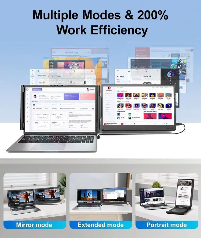 [Dual Screen Sync & 200% Increased Work Efficiency] This dual screen laptop screen extender enables seamless multitasking. Whether in extended mode or mirror mode, you can easily manage multiple windows without frequently switching workspaces, thereby increasing work efficiency by 200%. Suitable for IT professionals, stock traders, students, etc. ^^ [Auto-Adjustable Width & Portable Design] The laptop monitor extender has upgraded the automatic width adjustment button to make the operation easier, fitting laptops with screen sizes from 13" to 17". The screen extender also features a hook at the top of the back panel, allowing you to secure the extender onto your laptop, preventing it from slipping.