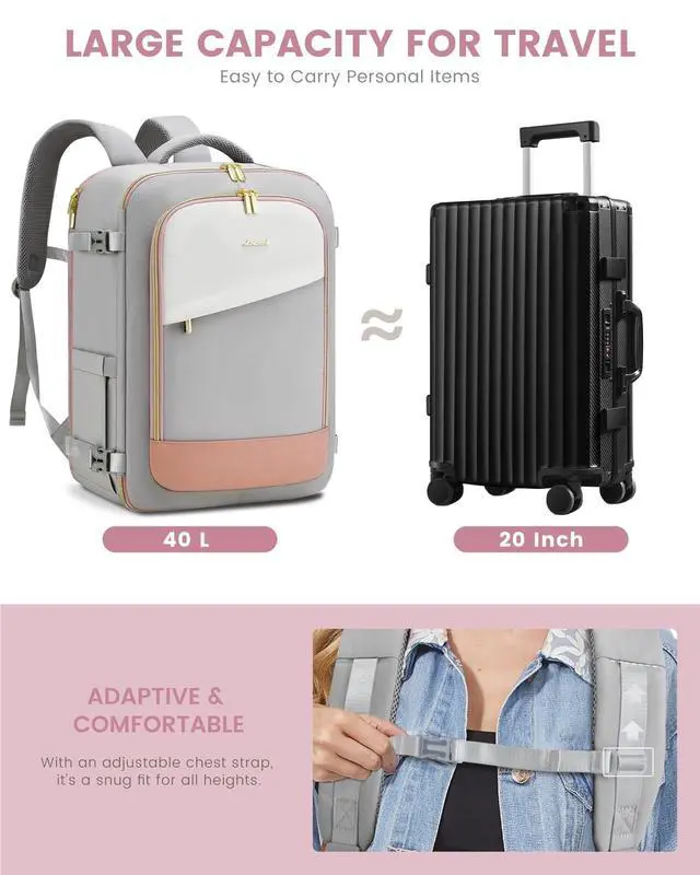LOVEVOOK Travel Backpack for Today's Woman Elevate your travel style with a backpack that marries fashion with function. Crafted from durable, scratch-resistant materials, this pack stands out in the crowd. ^^ Space Like No Other - A Whopping 40LWhether you're jet-setting for a weekend or heading out for longer, we're talking 40L of spaciousness. Plus, special compartments designed just for your 17.3 inch laptop and 12.9 -inch iPad! Think a weekend's worth of outfits, your tech gear, and then some. ^^ Keep It Clean and Dry Along with 2 packing cubes and an isolated shoe pouch, our backpack features a built-in wet bag.