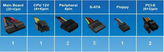 5x SATA Power Connectors (with full 5-wire) and 2x PCI-Express (6+2pin) Power Connectors. Made with high quality safe components as well as high current capacity wires. Each unit is verified for safety by going through a thorough HI-POT test. Additionally, a 1, 500 Volt AC spike is introduced at each ATX-1000N unit for up to 60 seconds under 10mA. Only units that can pass these tests get to be shipped out.