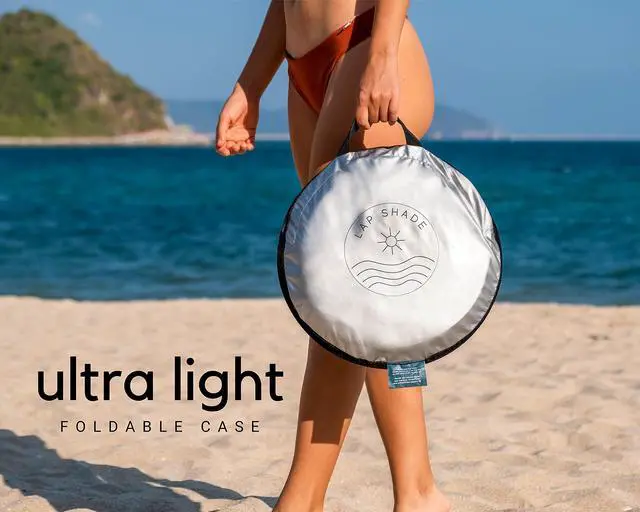 INCHES: Lap Shade can comfortably fit laptops and tablets up to 17 in diameter. It measures 14 diameter and 2 thick when folded, and 22 tall and 14.5 wide when expanded. It is easy to fold up and weighs only 1 lb. You can easily fit it into your beach tote, backpack, or simply hold it on its own with the handle.
