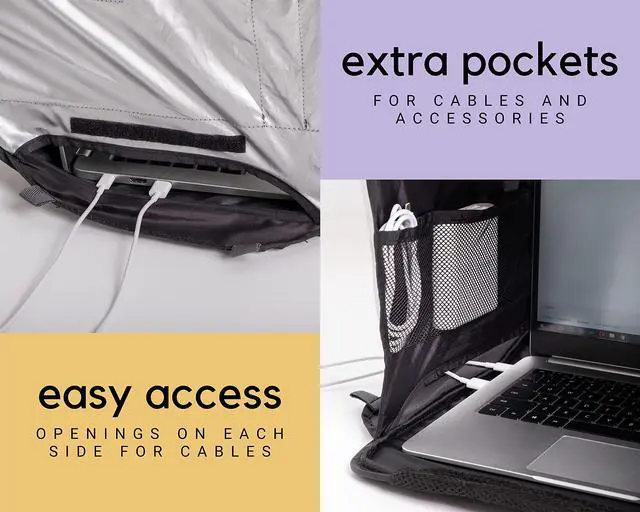 ^^ PRACTICAL AND PORTABLE: Lap Shade is ultra compact and folds easily into its own portable carrying case with a handle. There are pockets and openings on both sides for easy access to cables, smartphones, and other devices and accessories. To close the laptop shade, push the top blue tab to the bottom blue tab inside, ensuring that the logo is on the outside, then fold together. For instructions on how to close it, check the tag on the Lap Shade. ^^ FITS LAPTOPS AND TABLETS UP TO 17