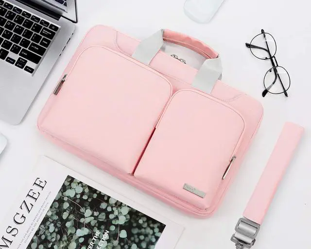 carry options include: grab handles, shoulder strap, the rear trolley strap. Top handles also can tuck away in the pockets when not needed. A slim and sleek profile allows this laptop sleeve to fit directly into your backpack, bag, briefcase, suitcase. It is a well-made laptop bag for 13-inch macbook that can be an anniversary or holiday gift.