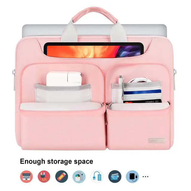 ^^ MULTIPLE POCKETS: The main compartment perfectly fits your macbook, with smooth metal zippers offer quick access. Extra two compartments and two front pockets own enough storage space allows you to store your iPad, small notebook, power brick and cord, charger, power bank, hard drives or other electronics. This laptop shoulder bag with lots of accessory pockets is very spacious and safe. A great macbook air carrying case to keep your every item secure and well-organized.