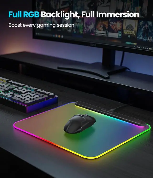 Mouse Pad: Experience vivid RGB lighting with a full backlight design that evenly illuminates the entire surface. The gaming mouse pad offers a dynamic, immersive lighting experience that enhances gameplay ambiance. Paired with a detachable 59'' USB Type-C cable, this mouse pad ensures an effortless setup for an enhanced visual experience. ^^ 6 Dynamic Lighting