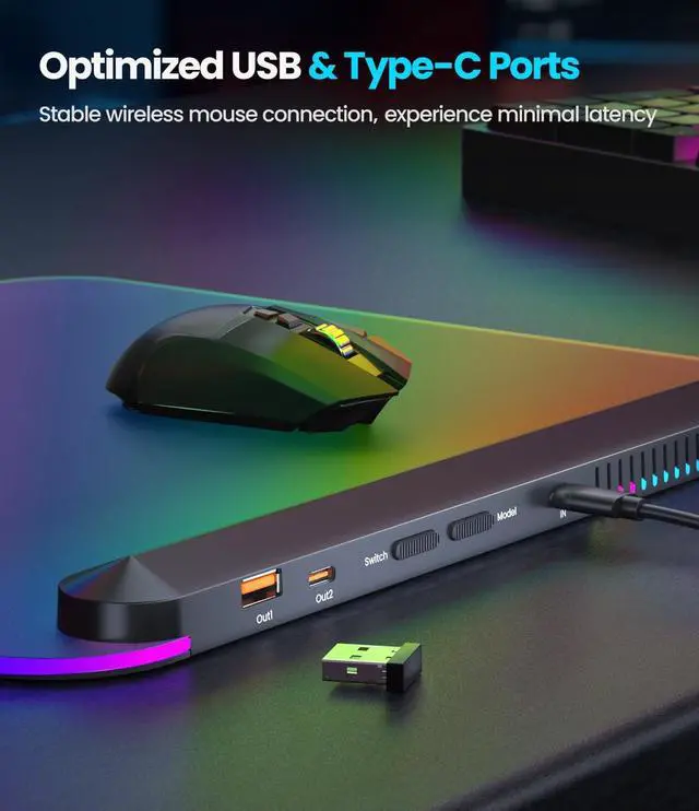 Modes & Colors: With 6 captivating lighting modesstatic color, color cycle, wave, spiral, flame, and beam movementyou can easily adjust the lighting to suit your gaming or work atmosphere. The mouse pad for desk offer several color options in Static mode, making it easy to create a lighting environment that's comfortable for long gaming sessions. ^^ Optimized USB 2.0 & Type-C Ports for