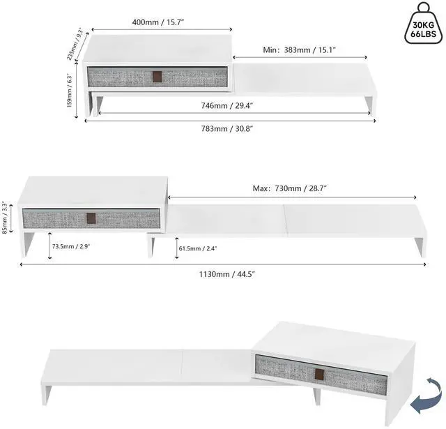 Length Range: 30.8 ''- 44.5 '', Angle: -90 to +90, two heights are available and swap left and right, if you need, you can let two screens are almost at the same level ^^ Perfect Desktop OrganizerOur computer monitor riser includes 9.25 inches practicality slide-out drawers for storing items like post-it notes, writing utensils and mobile devices. The keyboard can be placed under the bracket, save more space on your desk. ^^ Sturdy Computer Stand Extremely sturdy and stable, monitor stand is made of high-quality thickened MDF panel( 0.47 inch thickness). Maximum weight of 30kg/66lbs, you don't have to worry about collapsing or shaking during use. ^^ Computer Monitor Riser Easy Installation, In just a few minutes, you can get a multi-functional desktop stand, making you more comfortable and efficient at work. ^^ The wood used for the cabinet is FSC-certified.