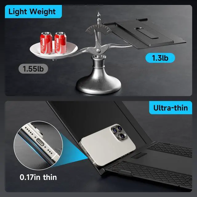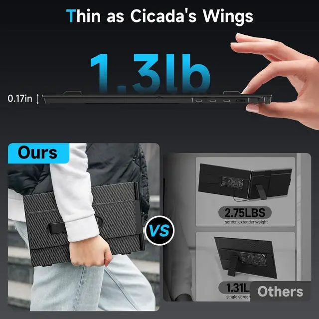 Ultrathin: Our laptop screen extender adopts the latest technology, making it the thinnest and lightest in size on the market, with a thickness of only 0.17 inches and a weight of only 1.3 pounds, which is only the weight of two cans of cola. It is suitable for computers ranging from 13 inches to 17.3 inches and is very suitable for travel and carrying.