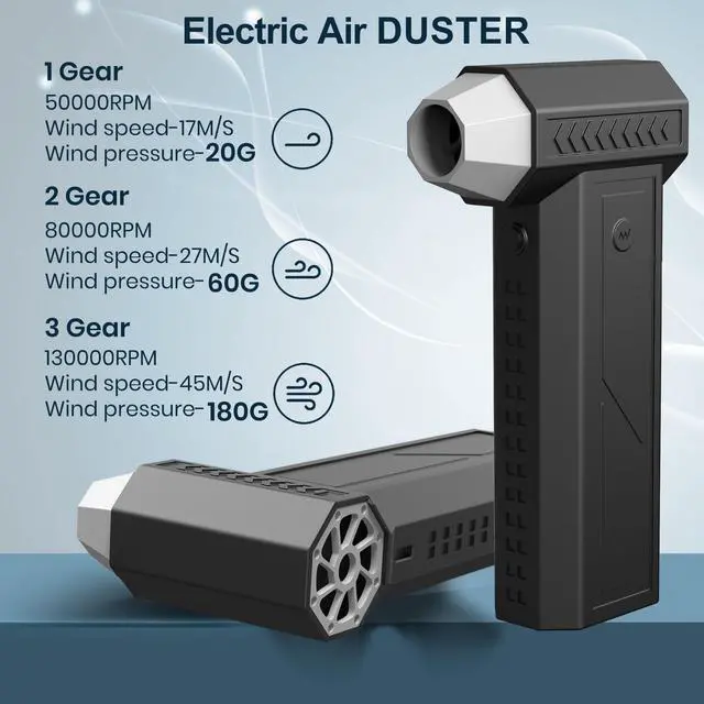 Adjustable 3 Speed Modes The air duster has a maximum speed of 130000 RPM motor and blowing force of 180G with 3 different air speeds with button.You can have a deep cleaninglow energy consumption work on the different equipment while retaining powerful airflow. The powerful wind force can clean up debris and dust on various devices easily.