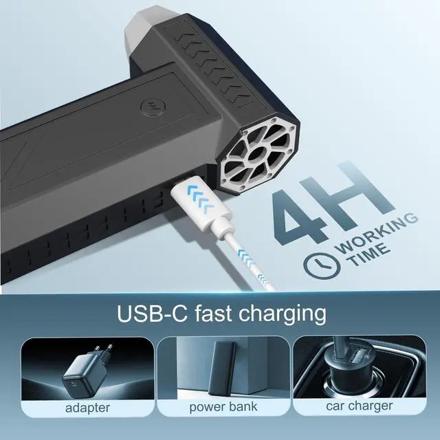 Rechargeable Air Duster Fast Charging : The cordless dust collector has a built-in 2000mAh battery, which can run continuously for 20-30 minutes. Comes with USB-C fast charging cable, fully charged within 2 hours, can be charged by computer, mobile power supply, car charger, adapter.high-definition LED display screen w