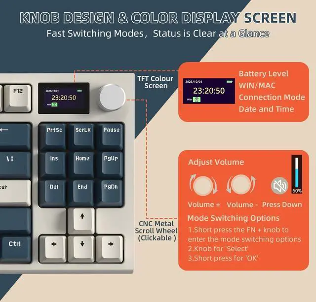 ^^ Precision CNC Metal Knob for Easy Control Take control like never before with the custom CNC aluminum knob. Adjust your display, volume, lighting effects, and more with a simple twist. Its tactile feedback ensures a smooth, satisfying experience, making it perfect for media control or fine-tuning your settings on the fly. ^^ Hot-Swappable TTC Sockets for Ultimate Flexibility Customize your typing experience with TTC hot-swappable sockets. Easily swap out switches for linear or tactile switches without soldering, and enjoy a smooth, stable, and quiet typing experience.