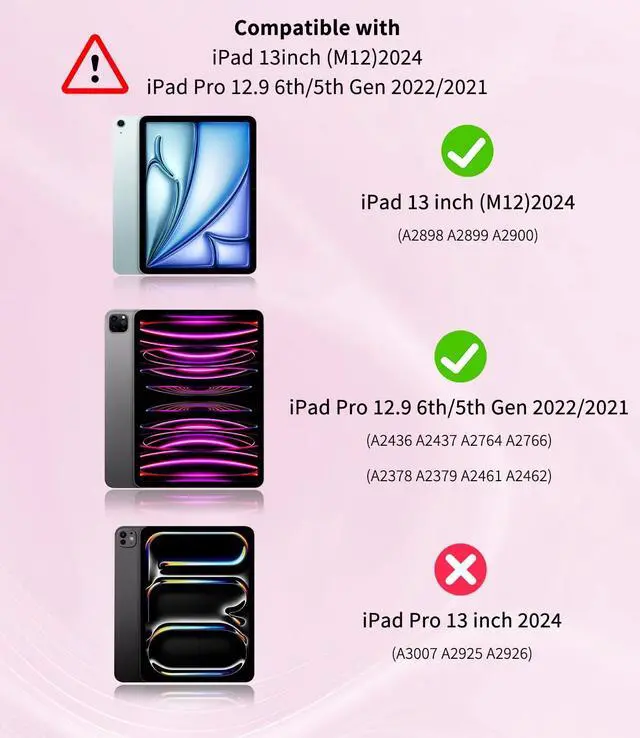 Wide Compatibility: This ipad keyboard case is designed to be compatible with the latest iPad models, for iPad Air 13-inch (M3/M2, 2025/2024) and the 12.9 -inch iPad Pro 5th and 6th Generation (2021/2022). Please verify your iPad model (A3269/A3271/A2900/A2899/A2898/A2437/A2764/A2766/A2378/A2379/A2461/A2462) before purchasing to ensure a perfect fit ^^