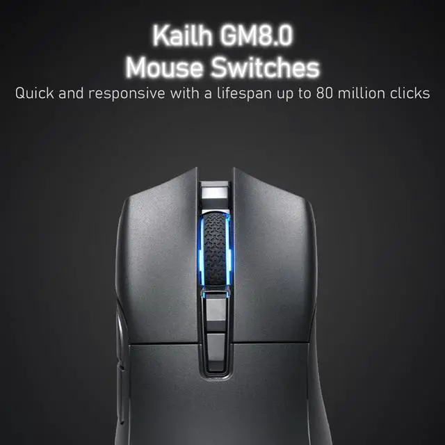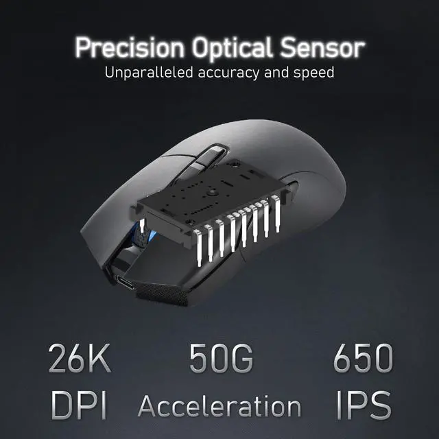High Efficiency Triple Mode Gaming Mouse 2.4G /Bluetooth/detachable USB-C cable wired mode for easy recharging and flexibility in connecting to a computer. Lightweight design, only 66 grams, to alleviate the burden on the wrist during gameplay. ^^ PixArt PAW 3395 Optical Sensor adjustable DPI up to 26, 000 dpi resolution. You can promptly adjust the moving speed for a fast response during gaming. ^^ Programmable Software convenient for DPI adjustment, programmable key functions, and light switching. Also, combining onboard memory for customized settings on the go. ^^ Kailh GM 8.0 Microswitches providing a click lifespan of 80 million times.