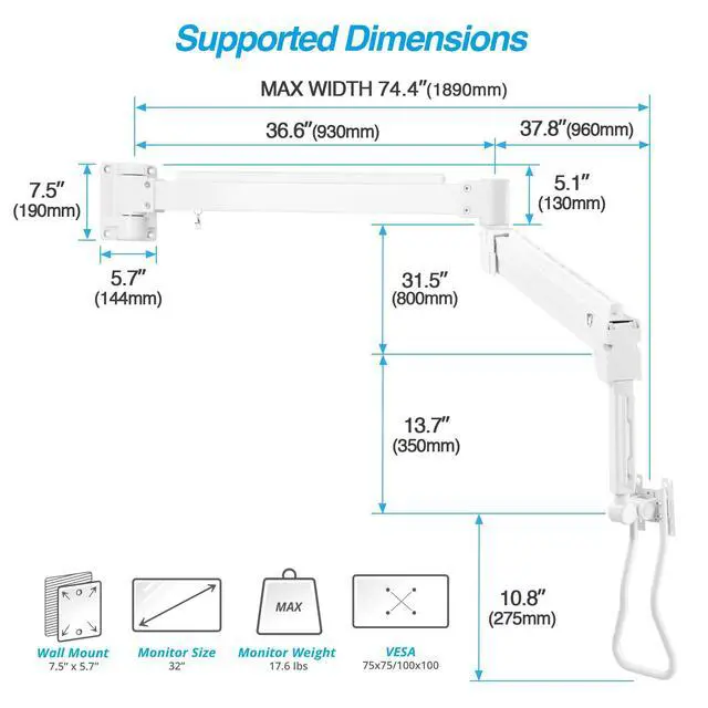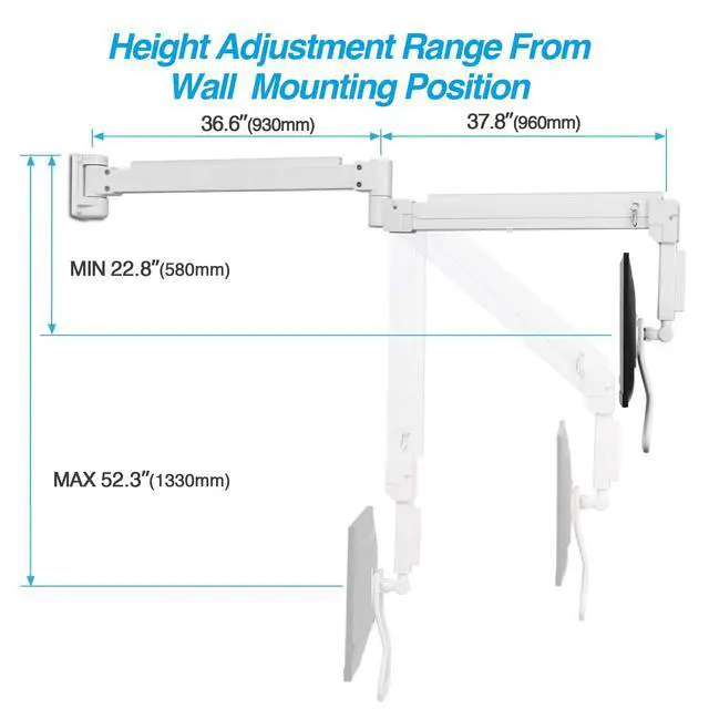 ^^ Ergonomic Adjustment: Gas spring arm offers up to 52" of height adjustment; supports tilt, swivel, rotation, and 74.4" ( 1.89 m) arm extension for ideal posture.