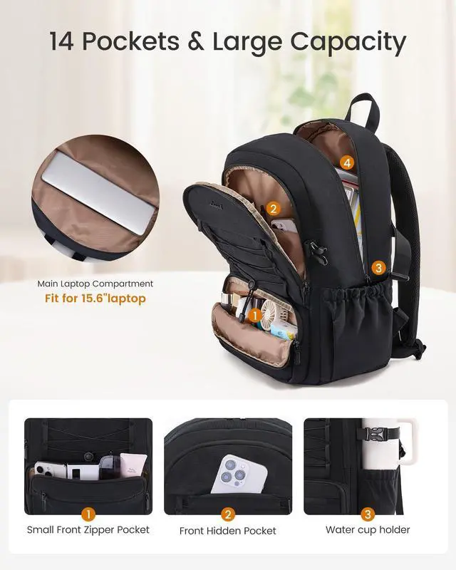 ^^ Spacious & Organized: This large capacity backpack purse for women features a dedicated, padded compartment that perfectly fits and protects 15.6" laptops. With 4 compartments and 14 functional pockets (including a hidden anti-theft pocket), it keeps all your daily essentials, tech gadgets, work items, and personal belongings neatly organized-all in one bag.