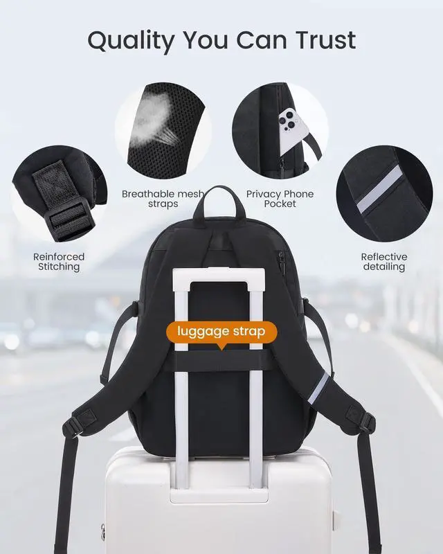 ^^ Lightweight & Comfortable: At just 1.82 lbs, this ergonomic backpack for women & girls features adjustable breathable padded straps for all-day comfort. The built-in luggage strap secures to your rolling suitcase for true hands-free travel through airports and stations.