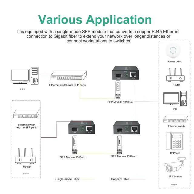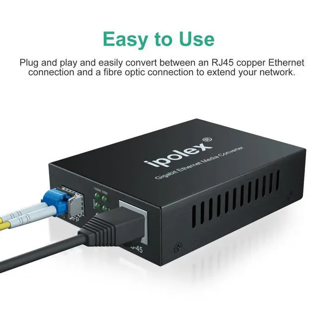 Seamless Conversion of LC Fiber to Copper This fiber optic to ethernet media converter kit includes a single mode 1000BASE-EX SFP module, which enables you to convert 1000BASE-EX LC fiber to 10/100/1000 Base-T RJ-45 copper media or vice versa. ^^ Extend Your Transmission Distance By using this ethernet fiber media converter, you can easily extend link distance up to 40 kilometers via OS1/OS2 single mode fiber (SMF, LC, Duplex). ^^ Plug and Play No software installation or configuration required. Hot-swappable design makes this ethernet fiber converter easy to install and troubleshoot. ^^ Reliable Auto-Negotiation Gigabit Connection 10/100/1000Mbps Auto-Negotiation RJ45 Port supports Auto-MDI/MDIX Crossover and Half-Duplex / Full-Duplex Transfer Mode, bridging different network speeds and devices to a Gigabit fiber network.