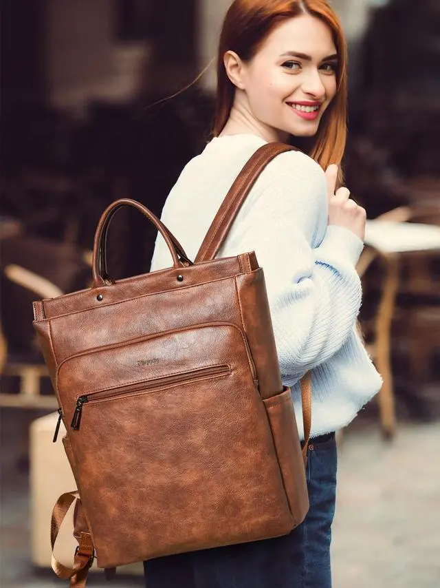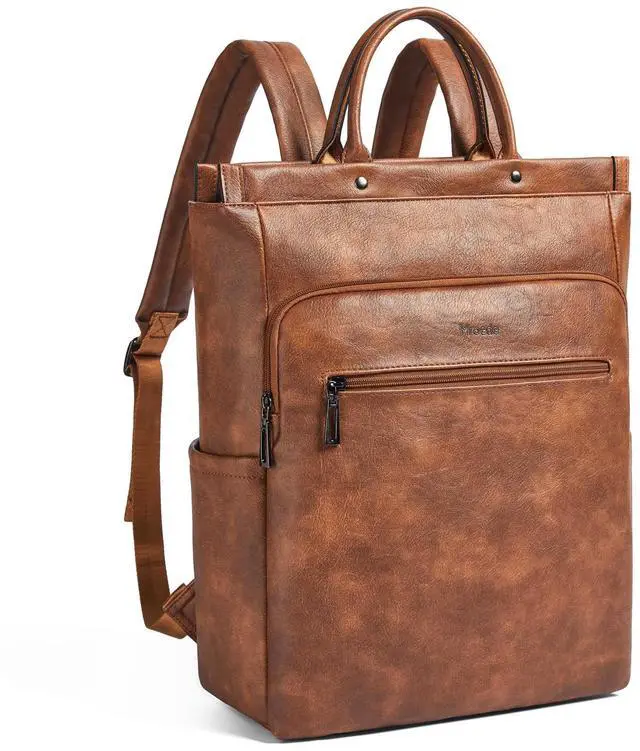 Women: Mroede leather laptop backpack made from high quality vegan pu leather and smooth zipper, and each seam is reinforced for durability. This leather backpack purse only can water-resistant against light rain and splashes.