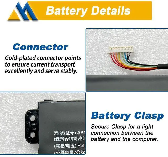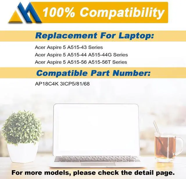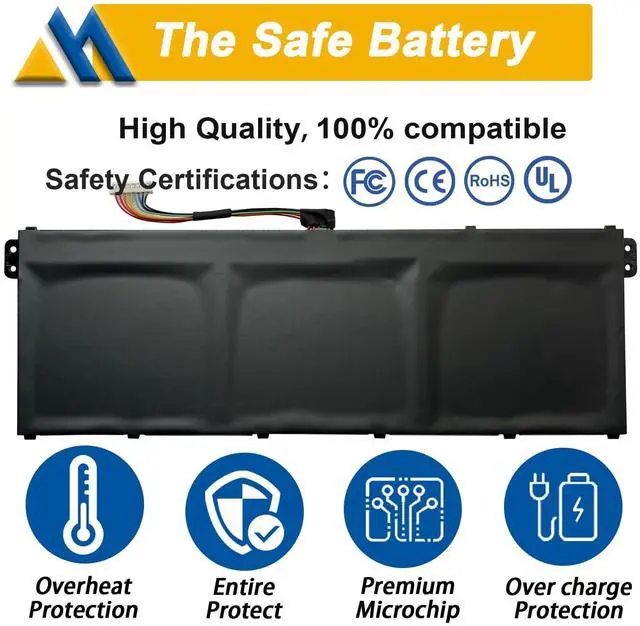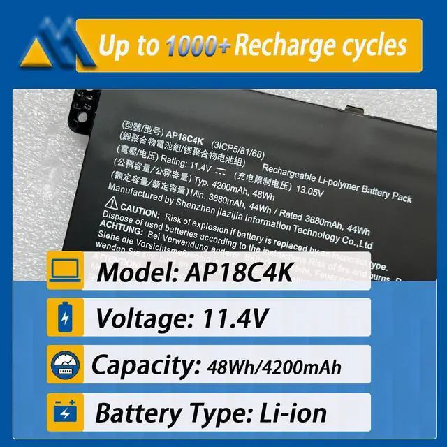 Battery type: Li-ion. (We only use grade A battery cells that provide up to 500 recharge cycles over the life of the battery. Come with screwdrivers. ) ^^ Compatible Part NumberAP18C4K, 3ICP5/81/68, AP18C8K, 3INP5/82/70, KT. 00304.012, KT. 0030G. 020, KT00304012, KT0030G020 ^^ Replacement For Laptop for ACER Aspire 3 A315-5 series. Aspire 5 A514-5, A517-52 series. ACER Aspire 7 A715-41G series. ACER Chromebook 314, 315 series. ACER Enduro EN314-51WEUN314-51W series. ACER Spin 3 SP313-51N, SP314-21 series. ACER Spin 511 R753T, Spin 512 R853TA series. ACER Swift 3 SF314-42, SF314-58 series. ACER TravelMate P2 P214-52, P2 P214-53 series. ^^ SecurityAll Mobik products are certified by UL / CE / FCC / RoHS for safety. Were so confident in the performance of our replacement laptop batteries, strict guidelines for compatibility, strict quality control standards and standards compliance for environment safety. (including short circuit, overheat, and overload protections. ) ^^ TipsIf the new battery is not recognized during the initial installation, please reinstall and check if the interface is fully connected.
