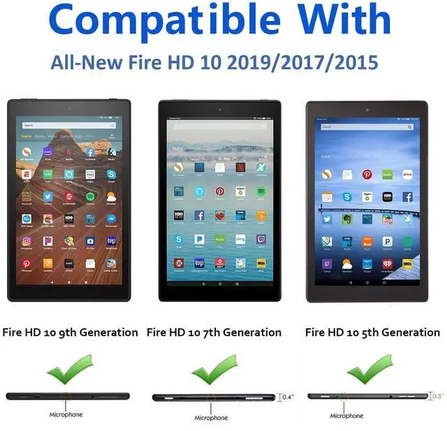 Feature Compatible Device: Fire HD 10 Tablet ( 9th Generation, 2019 Release ) Fire HD 10 Tablet ( 7th Generation, 2017 Release ) Fire HD 10 Tablet ( 5th Generation, 2015 Release ) Will NOT fit any other model, please kindly check your device carefully before purchasing.