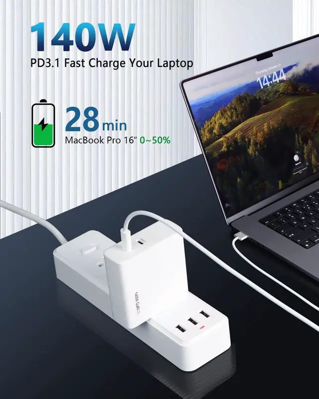 Power Max 140W: This 140W GaN Charger is designed with PD 3.1 protocol. Your laptop could be powered up to 140W by either Type-C1 or Type-C2 if the device supports 140W power input. With our 140W USB-C Charger, your MacBook pro enjoys 140 Watt charged with the USB-C to MagSafe 3 Cable. We did test for MacBook Pro 16 2021 charged with our 140W charger, it could be charged from power 0% to 50% in about 28 min. ^^ Smaller Size, Optimized